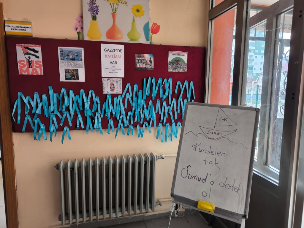 Filistin'de ki ablukayı kırmak için yola çıkan Sumud filosuna turkuaz kurdele takarak destek verdik.